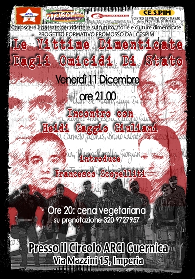 Venerdì 11 Dicembre alle 21 presso il Circolo Arci Guernica interverrà Haidi Giuliani all’interno di un progetto formativo promosso dal CESPIM: “Conoscere il passato per riflettere sul futuro, storie e culture dimenticate”.